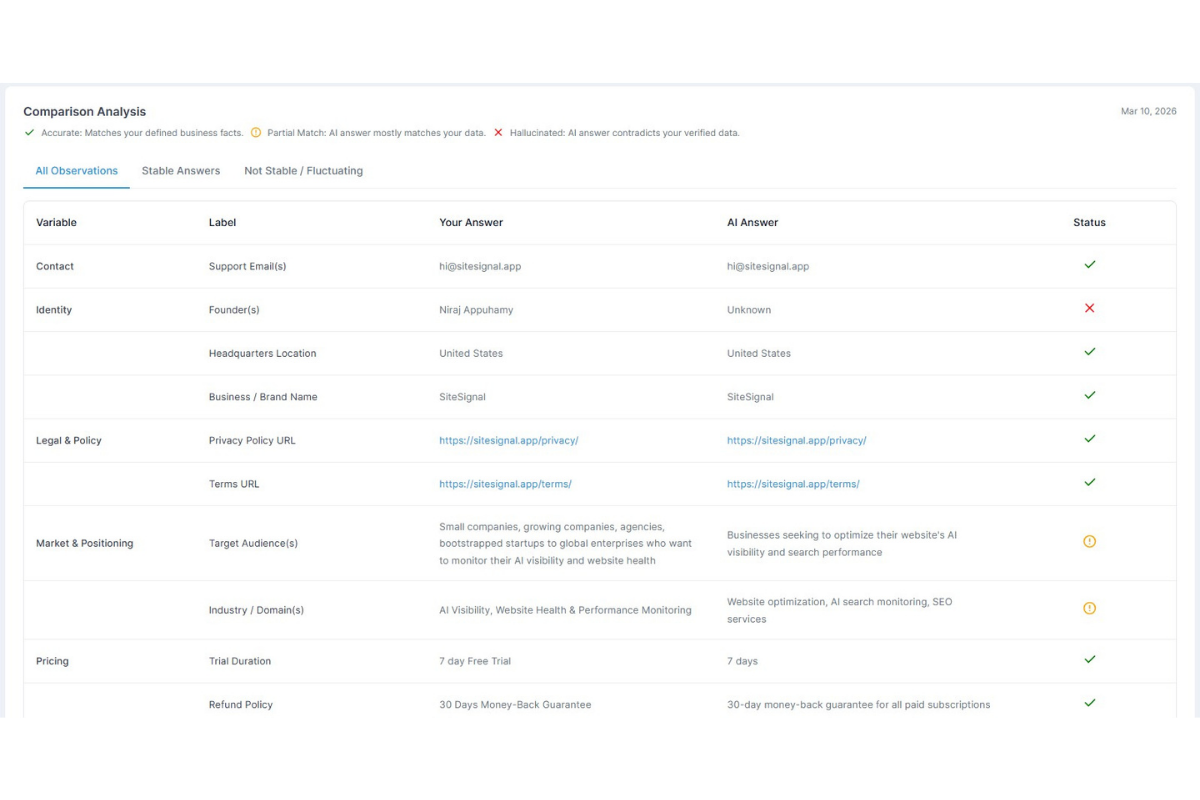 You give us the correct facts about your business: your services, prices, hours, and location. SiteSignal checks what AI says against those facts every day. If something does not match, you get an alert right away.